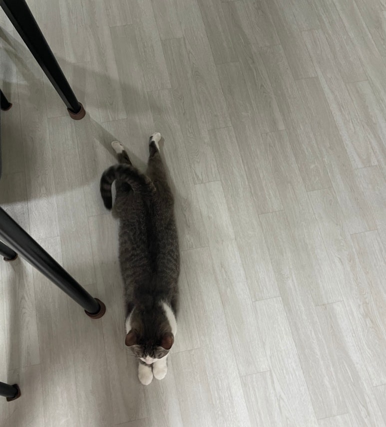 사냥 놀이 후 힘들어서 뻗은 고양이,,