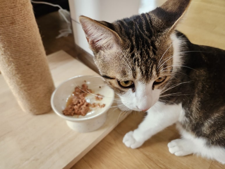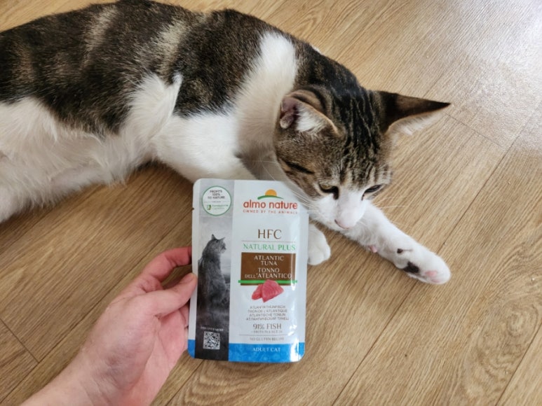 기호성이 너무 좋아서 그 후로도 꾸준히 내돈내산으로 먹였었는데 이번에는 캔이 아닌 고양이 파우치를 먹여보았다!