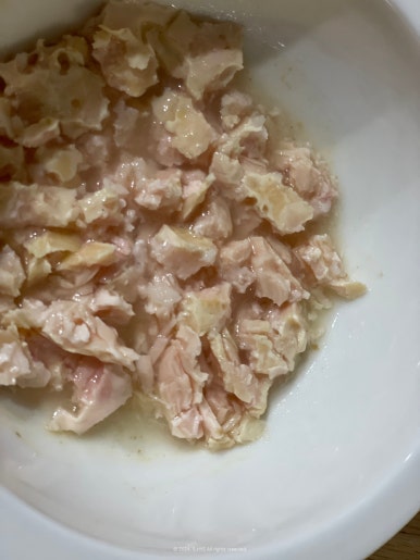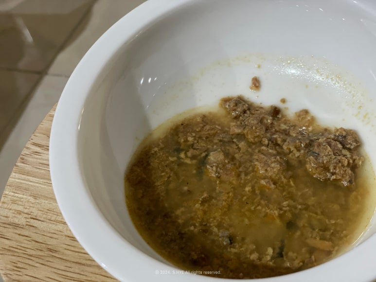 이건 닭가슴살이 좀 단단한 편이어서 숟가락으로 다 쪼개줬고, 냄새는 고소한 편이에요