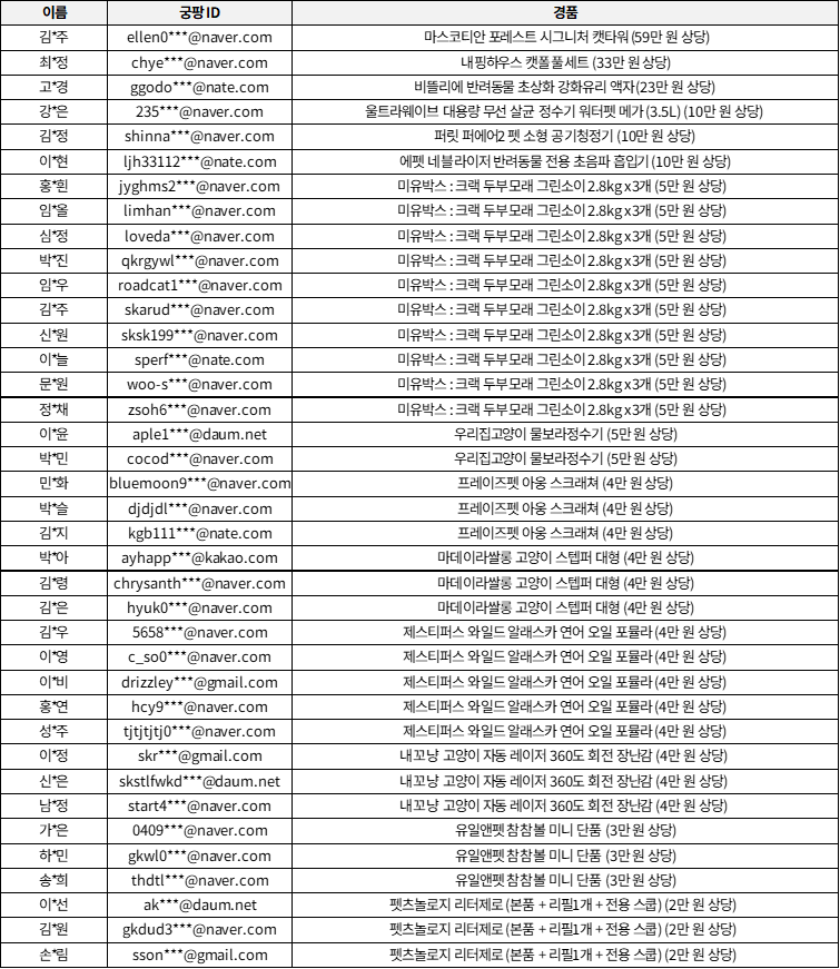 블로그/유튜브 후기 이벤트 당첨자 발표 많은 분이 참여해주신 궁디팡팡 캣페스타 블로그/유튜브 후기 이벤트! 여러분께서 정성껏 남겨 주신 모든 후기를 심사숙고하여 당첨자를 선정하였습니다. ![]() 선정되신 분들 모두 축하드립니다! * 9월 30일까지 꼭 궁팡앱 > 메뉴 > 문의하기 게시판에 배송 받을 주소와 연락처를 남겨주세요. * 경품은 각 업체를 통해 착불 또는 선불 발송되며, 당첨자분들께는 10월 1일 이후로 경품 발송에 대한 개별 안내 문자를 보내드릴 예정입니다. * 선정된 이벤트 후기 포스팅의 사진 또는 영상 등은 경품 제공 업체와 궁디팡팡 캣페스타의 홍보를 위해 사용될 수 있습니다. * 선정 시 선정 후기 이후 6개월간 선정된 후기 포스팅 또는 영상을 유지하여 주십시오. (삭제 또는 비공개 시 이후 이벤트 참여 불가) * 상품가 5만원 초과의 경품은 제세공과금(상품가의 22%)이 부과되며, 제세공과금은 본인 부담입니다. * 제세공과금 미납부 시 당첨은 취소됩니다. (제세공과금 납부 시 국세청 신고를 위한 신분증 사본 제출 필수) 또한 아쉽게도 더 많은 분을 선정하지 못하였으나 블로그/유튜브 후기 이벤트에 참여해주시고, 따뜻한 응원 글을 남겨주신 모든 분께 진심으로 감사드립니다. |